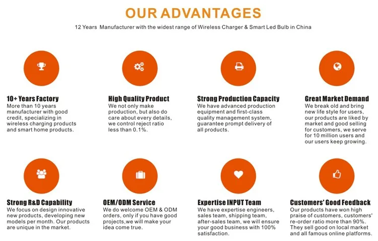 Our main products are Wireless Charger, Wireless Power Bank, Wireless Car Charger, iPhone Wireless Charger Receiver, Bluetooth Smart Led Lights and LED Writing Board etc.